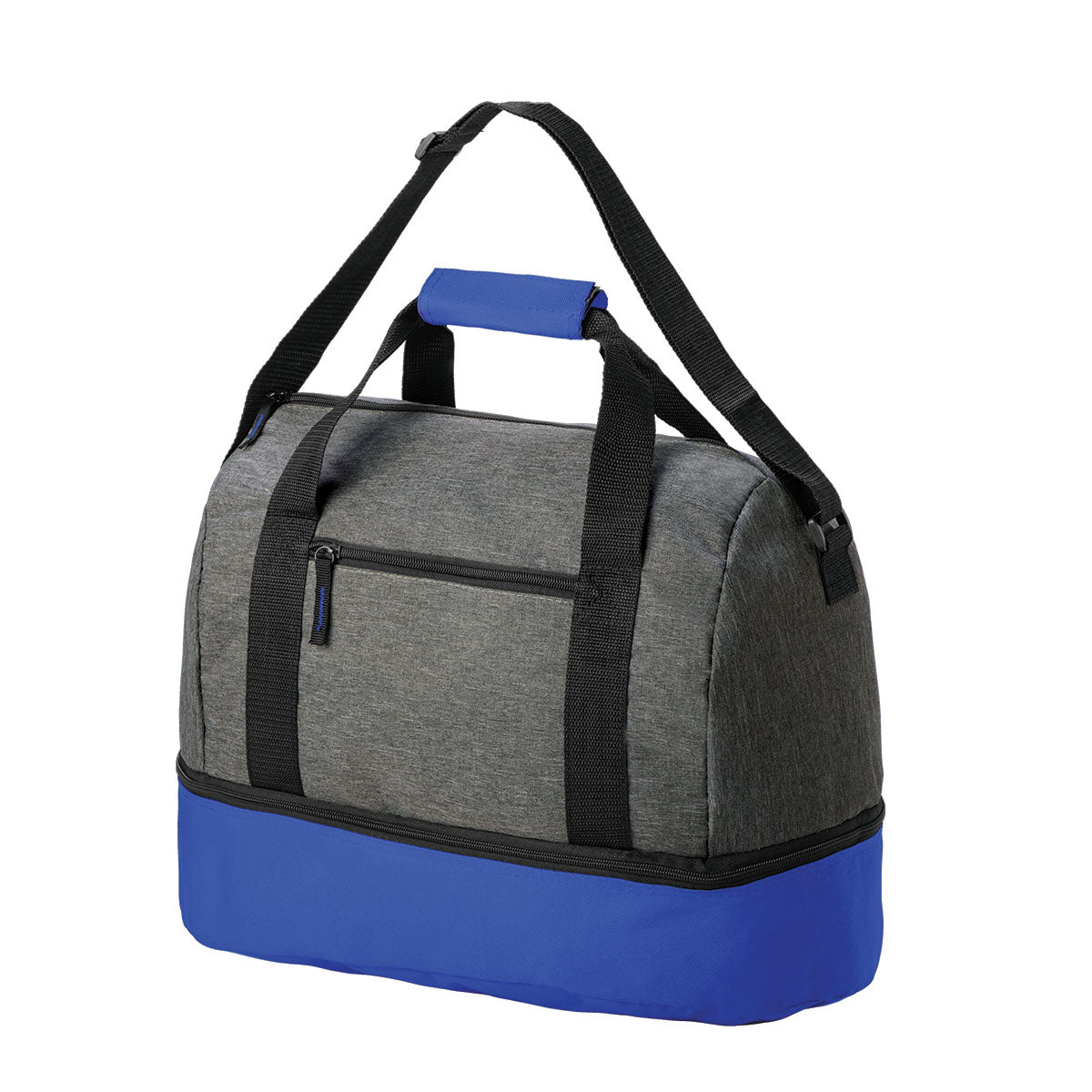 The Arena Double Decker Bag is manufactured using Two Tone 600 Denier material. The bottom compartment offers a stylish trimmed, double zippered compartment where you can store belonging such as shoes or anything you would like to separate from the top storage. There's a small front zippered pocket as well as a large zippered, main compartment. The bag features two carry handles as well as an adjustable shoulder strap.