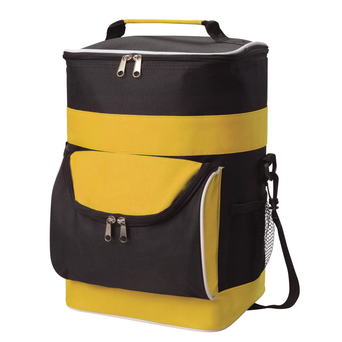 The Size Up cooler is perfect for larger storage needs. Its longer length makes it ideal for storing larger items such as wine and 2l soda bottles. Manufactured using 600 Denier material, insulated lining, elegant white piping and a side mesh pocket for added storage space. This cooler also includes a zip around lid and padded carry handle for ease of use. An additional smaller front zip up pocket is available, for additional storage, not required to be chilled.\n